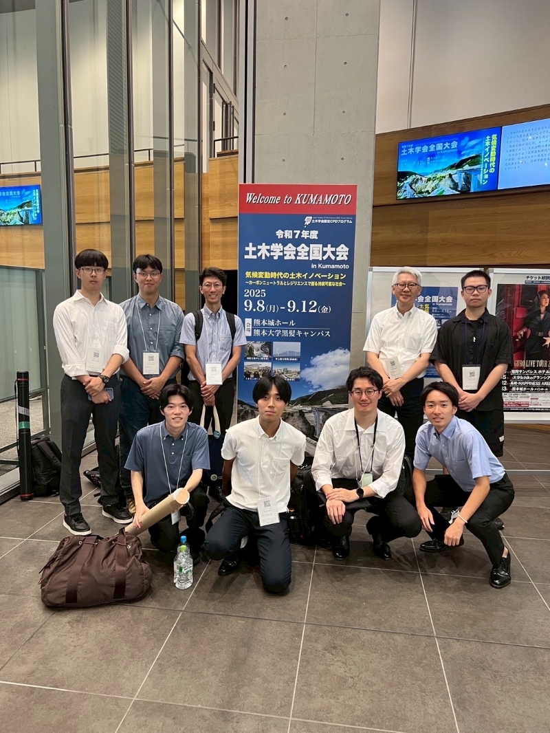 JSCE 2024 Annual Meeting was held at Tohoku University, 2-6 September. Akutsu, Chen (Debao), Fei, Hiro, Irawan, Kawabe, Ma, Sugimoto (graduated in 2024 Spring), Ueno, and Wang presented their research findings at the Meeting.
